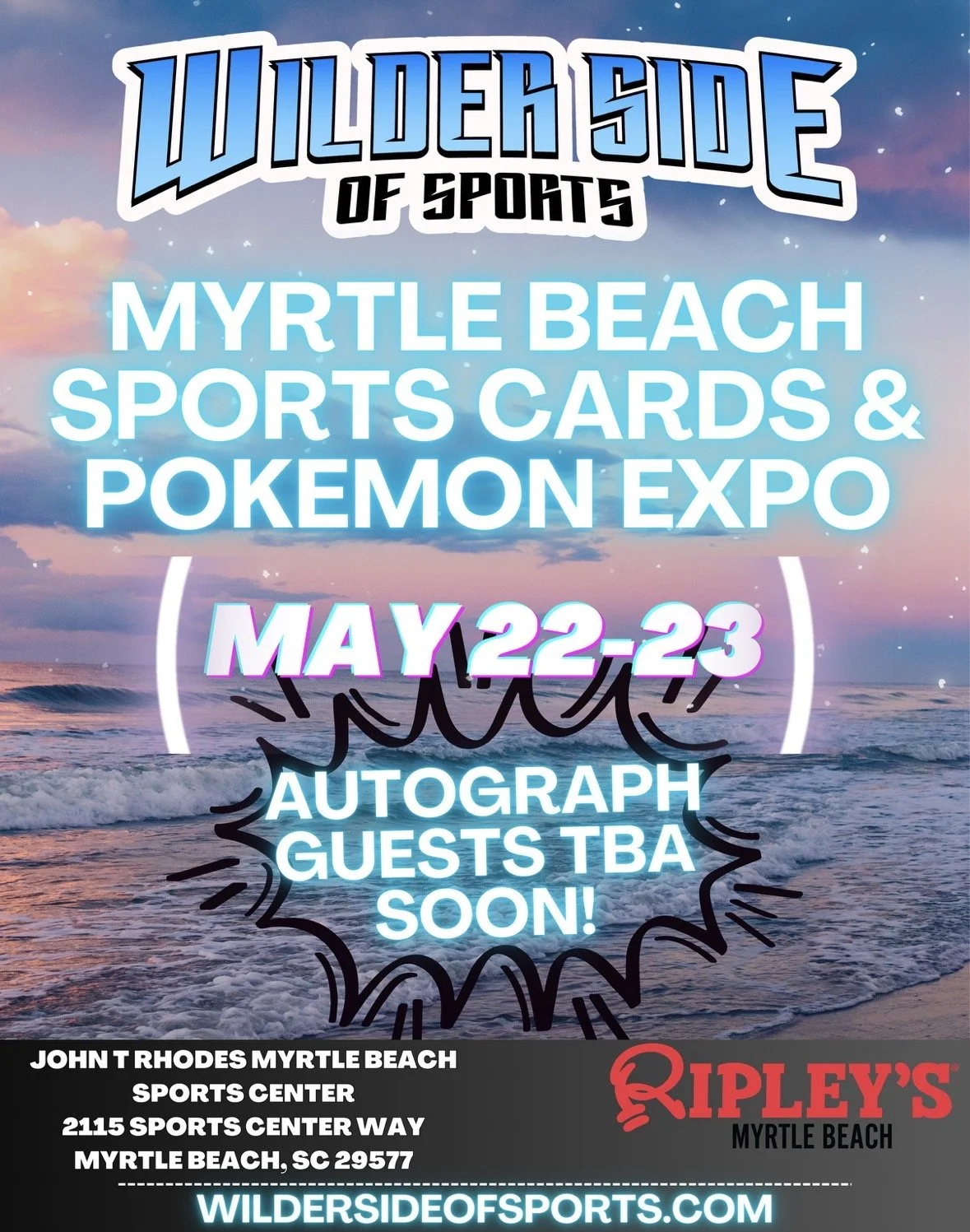 Join us for this annual 2 day show at the Myrtle Beach Sports Center just blocks away from the beautiful beaches of Myrtle Beach, South Carolina. The show will feature sports cards, Pokémon, supplies, sealed wax, memorabilia, autograph guests, vintage, high end, bargain bins, game used, giveaways, Pokémon, TCG, LIVE BREAKS, Trading area, Kids Zone!! Plan your beach vacation around the show!!!